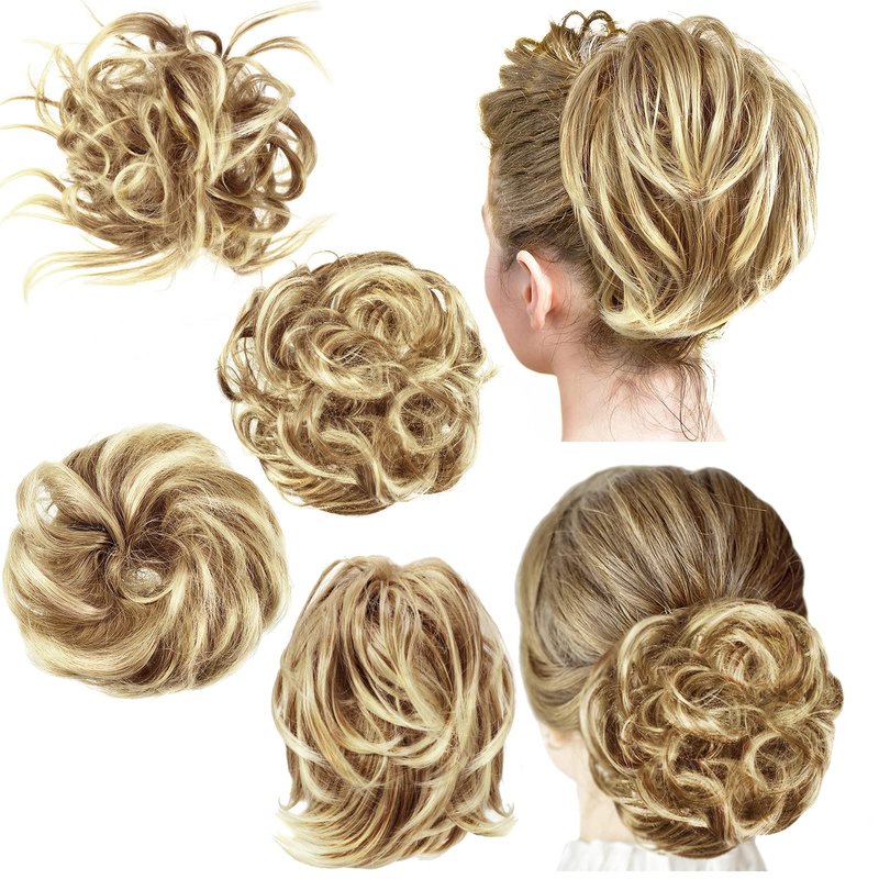 WILLBOND 4 Pcs Messy Hair Bun Hairpiece Tousled Updo for Women Hair Extensions Straight Short Ponytail Elastic Scrunchies Curly Hair Accessories (Honey Blonde mix Bleach Blonde/27T613, Basic Style)