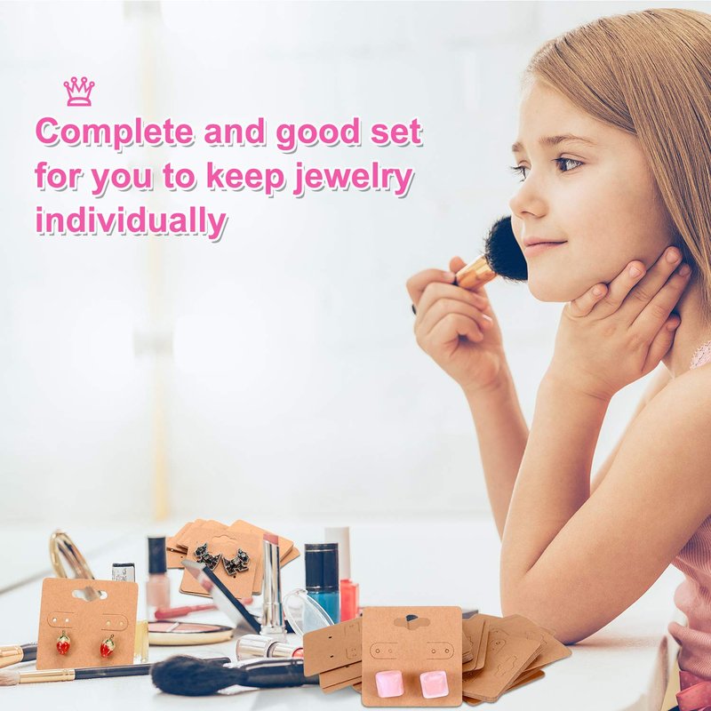 Features: Wide application: The earring cards can be served as earring display cards, earring tags, jewelry display card, earring studs price tags and so on, also good gift for sharing with your family and friends, they would love it. Practical tool: Each earring display card has three pre cut holes which can be applied to hang earrings, this set can make your earrings more organized and clean. Material: These earring card holders are made of kraft paper, thick, good texture, the earring backs are made of rubber material, soft and safe for your use. Specifications: Earring display card material: kraft paper Bag size: approx. 6 x 8 cm/ 2.4 x 3.1 inches Jewelry display card size: approx. 5 x 5 cm/ 2 x 2 inches Package includes: 100 x Earring display cards 100 x Self sealing bags 200 x Earring backs Note: Small parts included, please keep away from children.