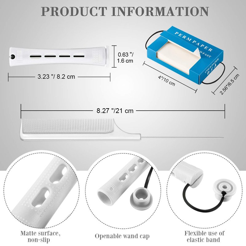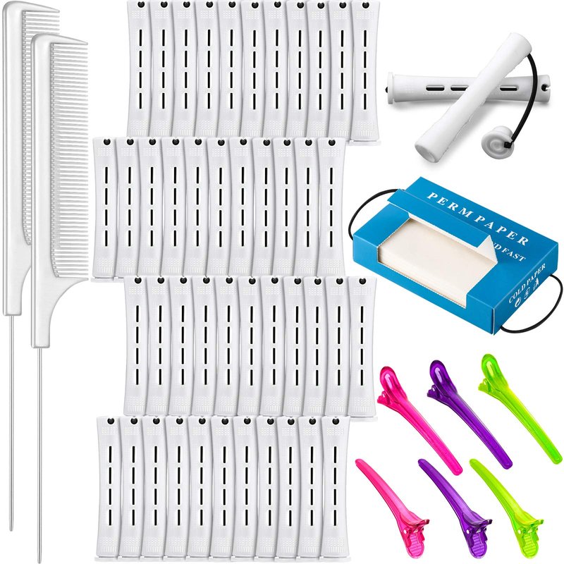 48 Pieces hair perm rods plastic cold wave rod perming rod curlers hair roller, 2 pieces steel pintail comb rat tail comb, 350 pieces perm paper and 6 pieces duck bill clip for hairdressing stylingFeatures:Practical design: Our hair perm rod features several vents for better saturation, its wide slot design can evenly distribute liquid to the hair during curling, helping you create beautiful hair styling like curly hair, wavy hair, fluffy hair, and so on.Easy to operate:1. Use the tail comb to remove hair knot and tangles, then separate your slightly damp or dry hair into small sections.2. Choose a section of hair and cover hair end by perm papers.3. Wrap it on the hair perm rod, fix it on your head with rubber band.4. Wait for 30 minutes to 1 hour, you can also use hair dryer or stereotyping water to stereotype the hair curls and waves quickly.5. Untie the hair perming rod and you can adjust the hair waves as you like.Caring gift choice:The hair curling rollers are suitable for home and hair salon use, practical for various hair length and styles. These practical hair styling tools also the sweet gifts for sister, girlfriend, mom and more.Specifications:Material: plastic, steel and quality paperColor: as picture shownSize:Perm rods: approx. 8.2 x 1.6 cm/ 3.23 x 0.63 inch Perm papers size: approx. 10 x 6.5 cm/ 4 x 2.56 inchPackage includes:48 x Hair perm rods2 x Rat tail comb6 x Duckbill hair clip350 x Perm papersWarm note:Pointed parts included, please keep them away from little kids.Manual measurement, please allow little size error.The colors may exist slight difference due to different screens.
