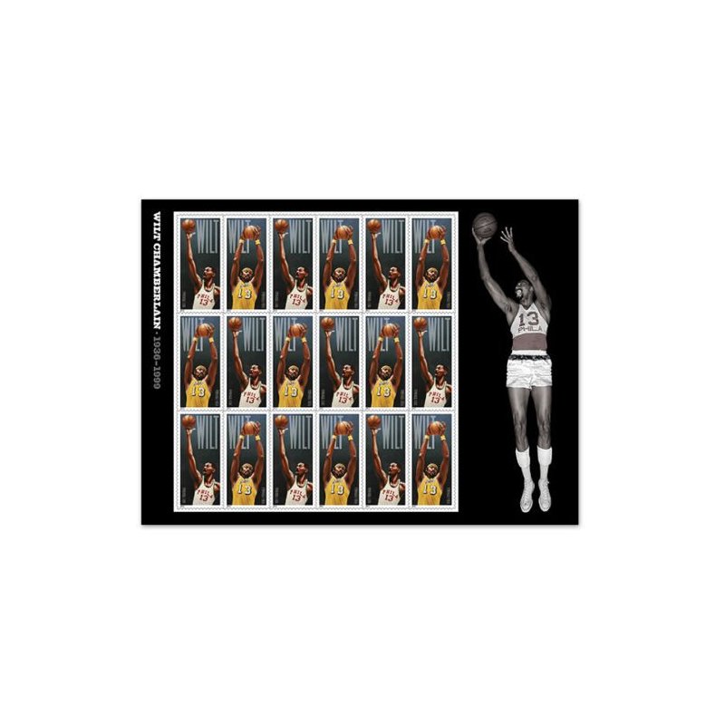 The icon whose dominance literally changed the rules of basketball returns to center court Friday to receive a stamping ovation when he becomes the National Basketball Association’s (NBA) first player to be immortalized on a U.S. postage stamp. The stamps, just over 2 inches tall each, are a third to twice the size of a typical commemorative stamp height. Kadir Nelson, of San Diego, CA, created the two stamp image portraits of the NBA superstar. One is based on a photograph of Chamberlain in a Philadelphia Warriors uniform; the other is based on an image of Chamberlain in a Los Angeles Lakers uniform. The word “Wilt” is featured in either the top right or left corner of each stamp. Art director Antonio Alcalá of Alexandria, VA, designed the stamps. As a center, Chamberlain dominated the NBA for more than a decade, setting a plethora of individual records. He led his teams to two NBA championships and in 1962, scored an NBA record 100 points in a single game. The Wilt Chamberlain Limited Edition Forever stamps, available in sheets of 18 stamps, will always be equal in value to the current First-Class Mail 1-ounce price. This listing is for a sheet of 18 stamps