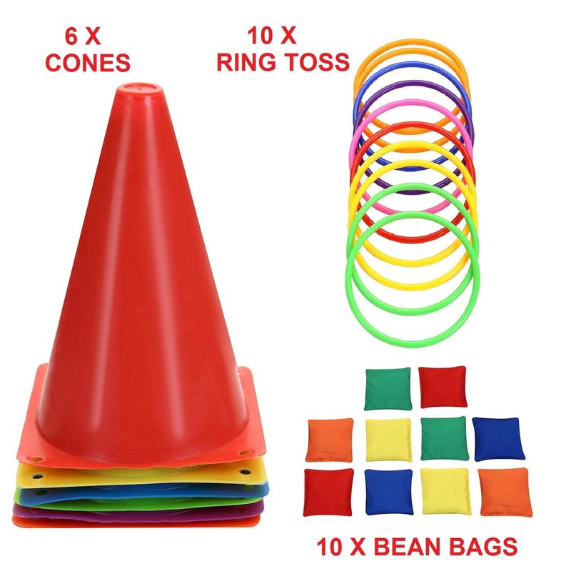 Win SPORTS 3 in 1 Carnival Outdoor Games Combo Set, Soft Plastic Cones Cornhole Bean Bags Ring Toss Games,for Kids Adults Indoor Outdoor Birthday Party Lawn Games Supplies (26 Pieces