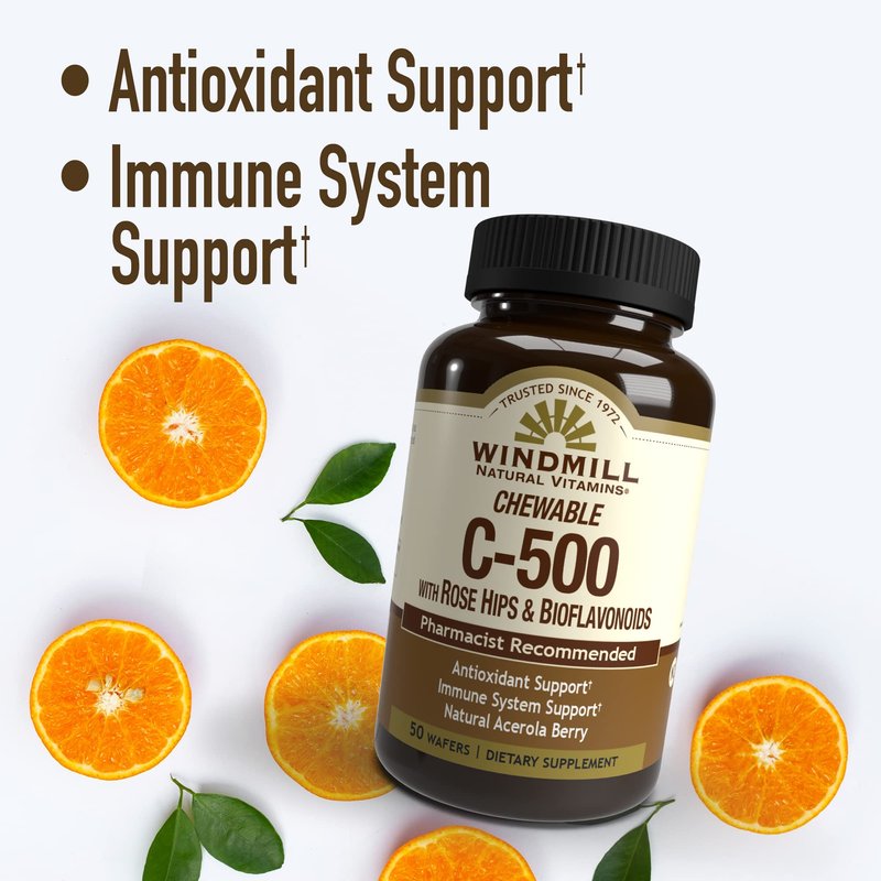 Windmill Natural Vitamins Vitamin C 500 mg, with Rose HIPS and Bioflavonoids, Immune Booster, Antioxidant Support, Chewable Tablets, Acerola Berry, 50 Tablets, 50 Servings