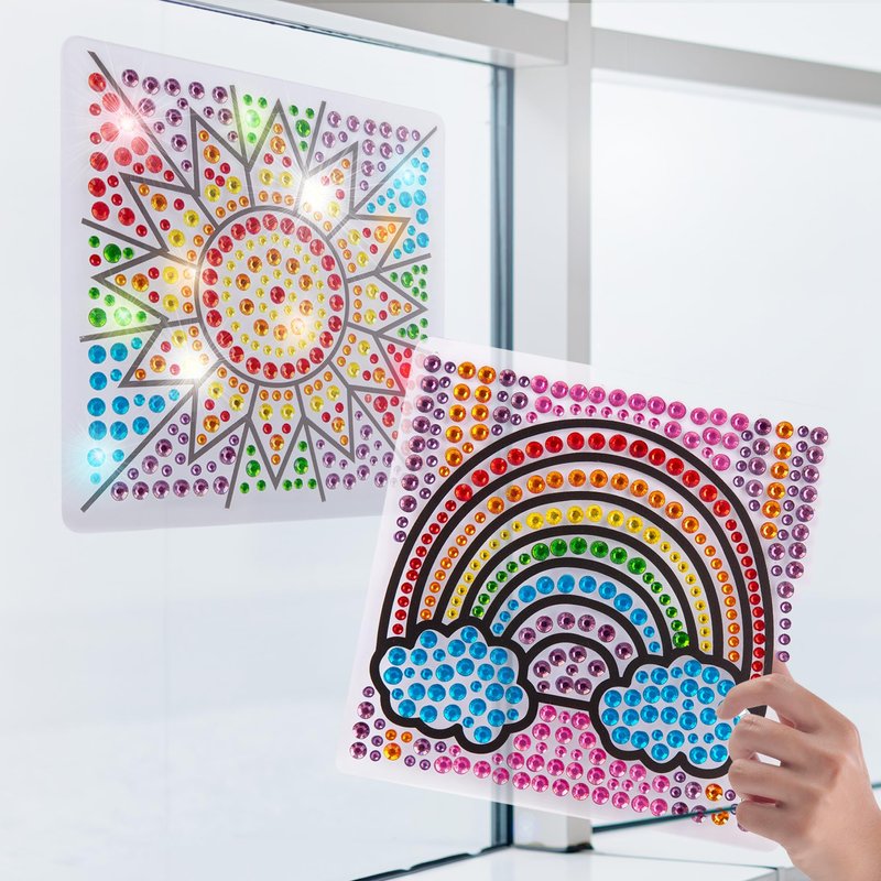 - CREATIVITY FOR TWO: Made for sharing, this kit has enough supplies to create 2 dazzling suncatchers. It includes 2 sticky plastic sheets, bags of colored gemstones, 2 stylus tools, 2 small trays, 2 squares of sticky wax, and double-sided tape for hanging.