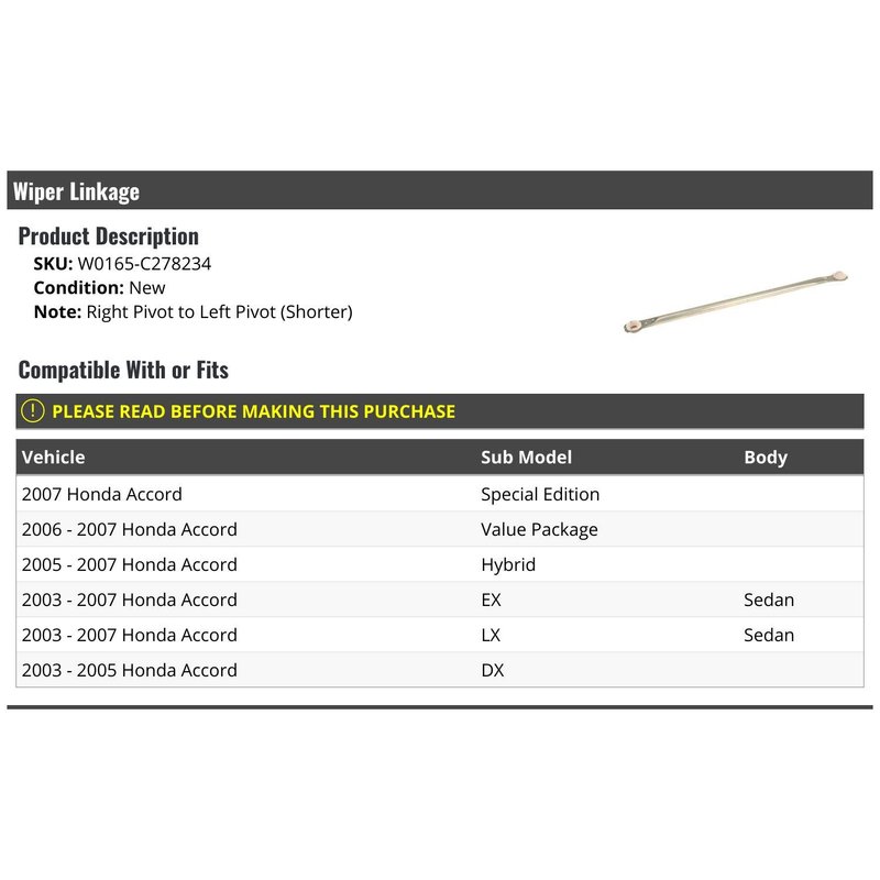 Wiper Linkage - Compatible with 2003 - 2007 Honda Accord SedanNote: Right Pivot to Left Pivot (Shorter)Compatible With or Fits: - 2007 Honda Accord Special Edition - 2006 - 2007 Honda Accord Value Package - 2005 - 2007 Honda Accord Hybrid - 2003 - 2007 Honda Accord EX Sedan - 2003 - 2007 Honda Accord LX Sedan - 2003 - 2005 Honda Accord DX
