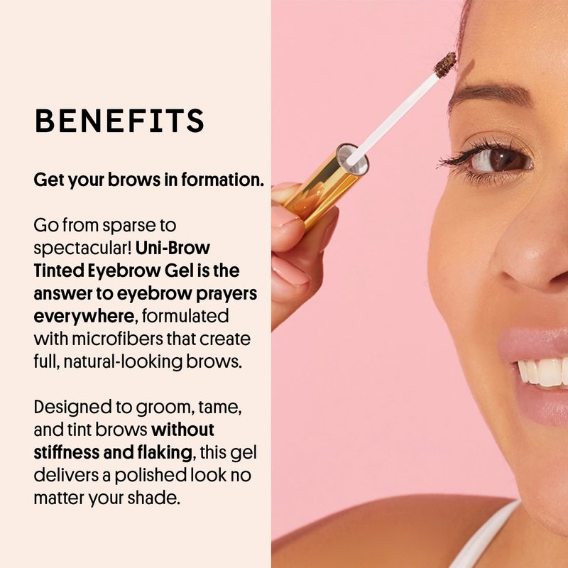 - Directions: Using the tapered brush, apply tinted brow gel using short upward strokes to groom brows into place. Apply brow gel alone for a fluffy, natural finish, or use over any Uni-Brow pencils for added definition.
