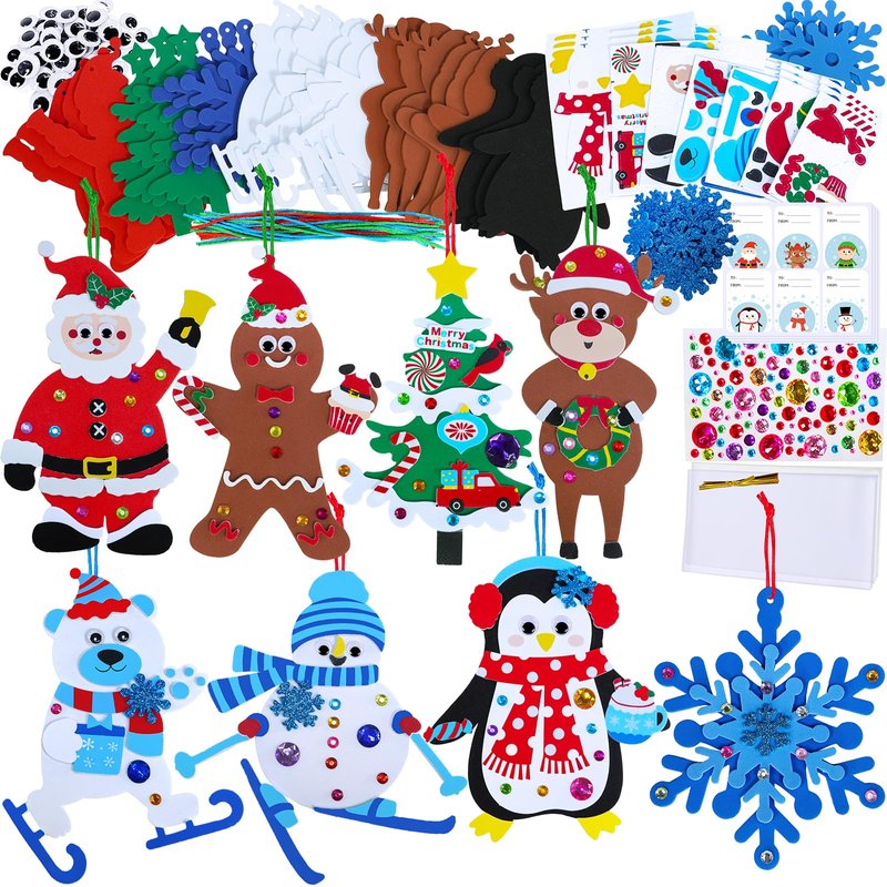 - Bulk DIY Christmas Ornaments Craft Kits: Our kit has everything you need to create 24 peel-and-stick Christmas ornaments. It includes 24 foam bases featuring Santa, Santa's friends, Christmas tree, and snowflake, 228 Christmas-themed foam stickers on 21 sheets, 46 googly eye stickers, 6 snowflake foam stickers, 12 glitter snowflake foam stickers, 2 sheets of colorful jewel stickers, 24 satin cords for hanging, 24 plastic bags, 24 twist ties, 1 step-by-step guide, and 24 Xmas gift stickers.