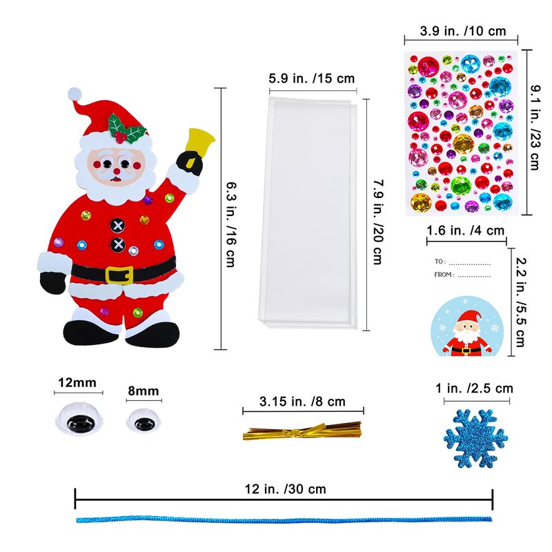- Perfect Size: The foam bases of Santa, Santa's friends, Christmas tree and snowflake and Holiday foam stickers are designed in sizes perfect for little hands. The Christmas foam bases are 6.3" tall, Holiday foam stickers range from 0.7" to 3.5" in width, Googly eyes are about 0.3" and 0.47" wide. Satin cords are 11.8" long, The finished Christmas and Winter ornament is about 5.5" x 6.3", making it an ideal size for hanging on Christmas trees, mantels, walls, windows, or using as gift toppers.
