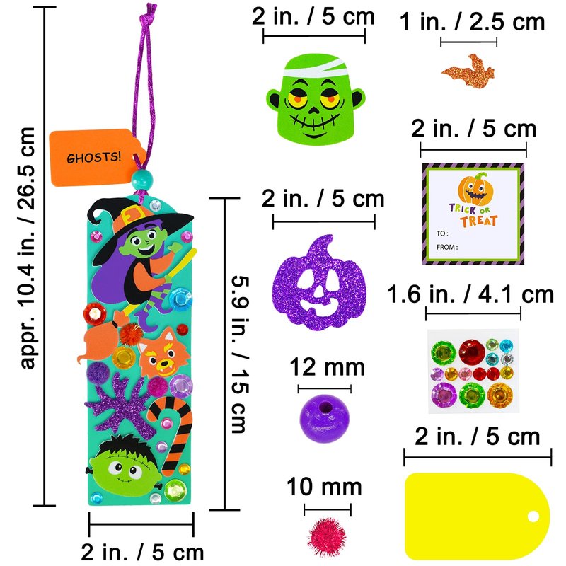 • Perfect for Little Hands: Halloween bookmark foam bases are 5.9" tall and 2" wide. Assorted Halloween-themed foam stickers and glitter stickers are range from 1" to 2.8" wide. Pom-poms are 0.4" wide. Cords are 11.8" long. Just right sized for little hands. Kids will love creating their Halloween Bookmark by peeling and sticking the stickers and stick pom-poms onto the foam base. The finished halloween bookmarks are not only easy to mark pages in book, but also serve as ornaments.