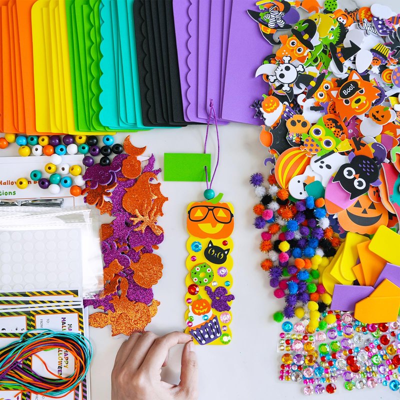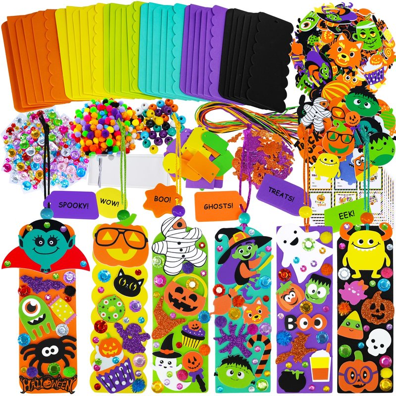 • Bulk & Versatile DIY Halloween Craft Kit: Our pack provides materials for 36 easy-to-create, peel-and-stick Halloween bookmarks, perfect for organization, gifting, and group activities. The Halloween craft kit includes 36 blank foam bookmark bases in 6 designs, 180 Halloween characters, treats, and creatures foam stickers, 48 glitter foam Halloween stickers, 100 pom-poms, 36 cords, 36 jewel sticker, 36 treat bags, 36 twist ties, 100 adhesive dots, 2 guides, and 36 cute Halloween gift stickers.