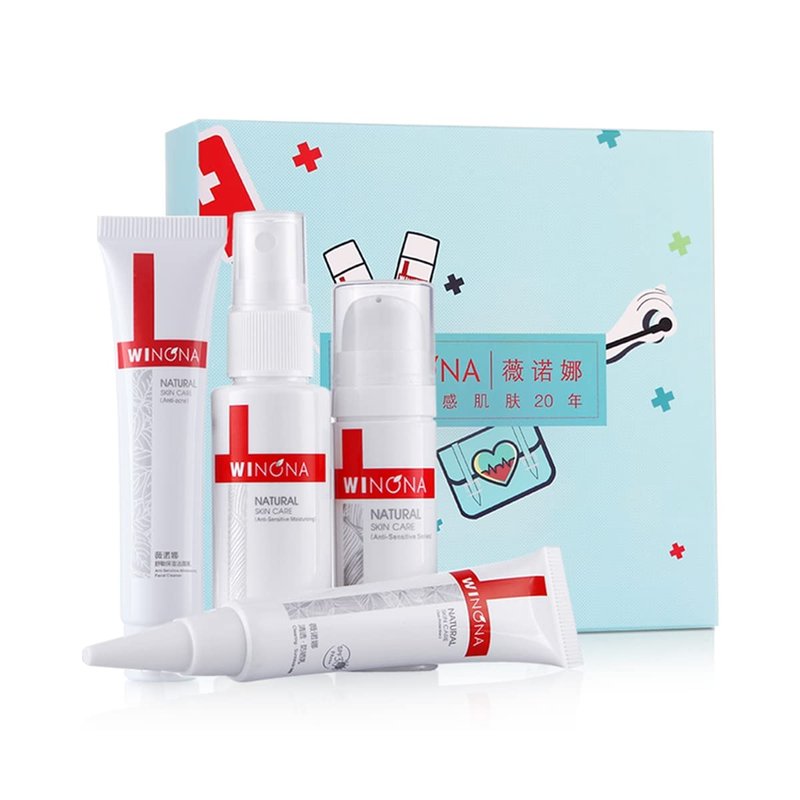 Winona Dry Sensitive Skin Gift Set. 30ml Soothing Moisturizing Lotion*1 15g Soothing Moisturizing Extra Care Cream*1 15g Soothing Moisturizing Cleanser*1 15g Facial Suncreen*1 Suitable for dry skin and sensitive skin.
