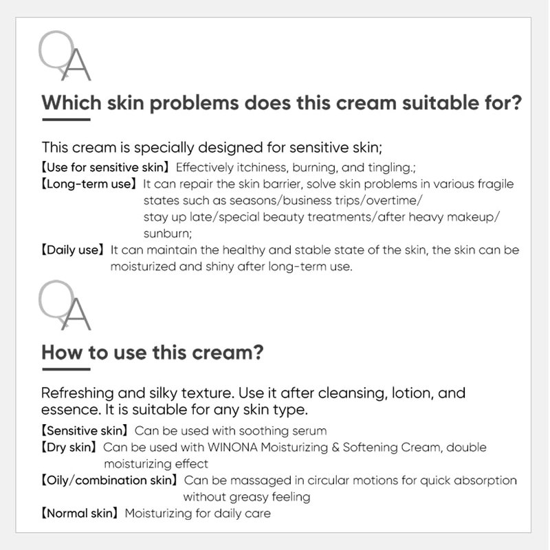 - WINONA Facial Sunscreen: 15g/0.53oz,WINONA Sunscreen protects against the full spectrum of UVA and UVB rays. Spread WINONA Sunscreen evenly and flatly over the skin surface to form a high-density protective barrier that blocks environmental damage to the skin. Suitable for sensitive skin.