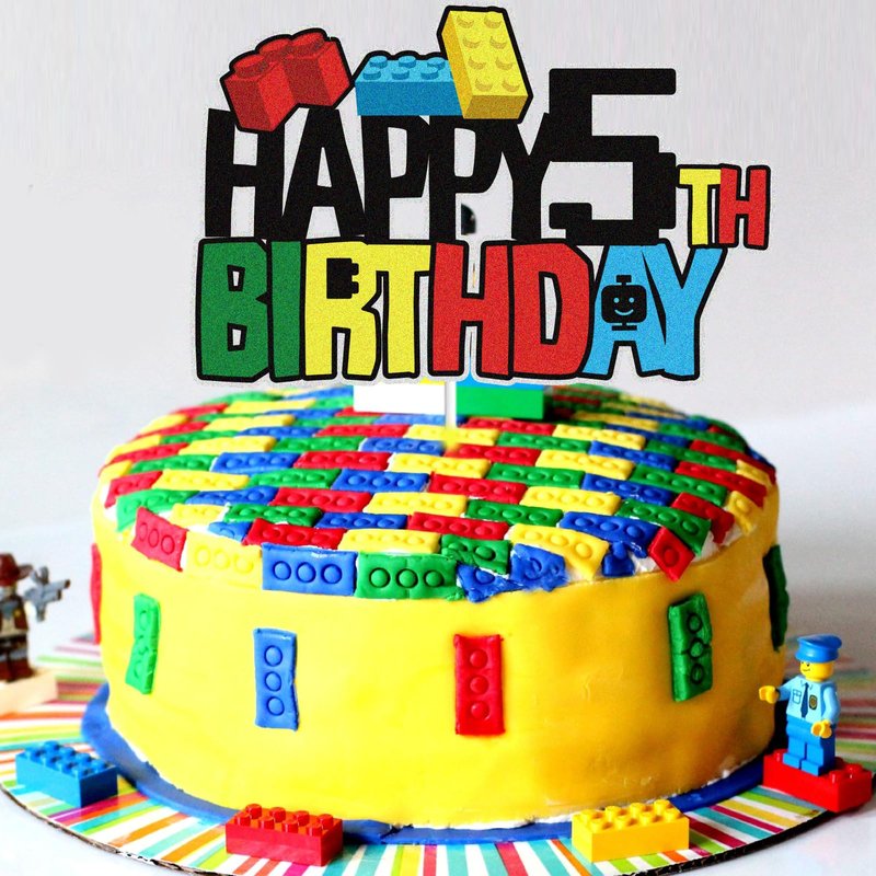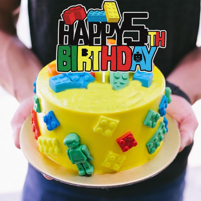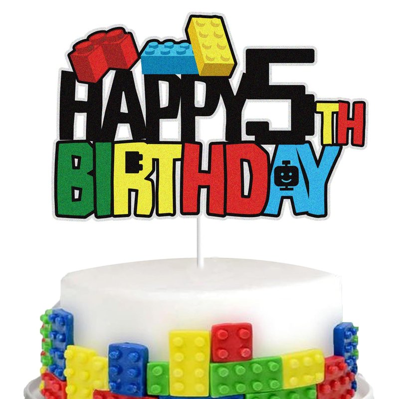 WINPOGEE Building Blocks Happy 5th Birthday Cake Topper Colorful Glitter 5 Five Years Old Building Brick Theme Birthday Party Supplies for Boys Girls Kids