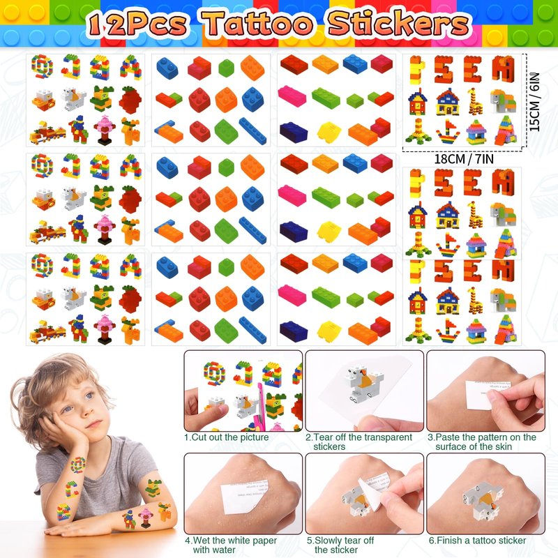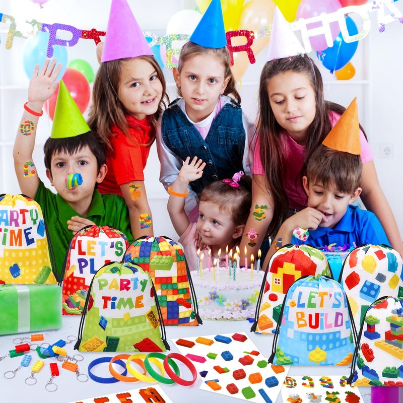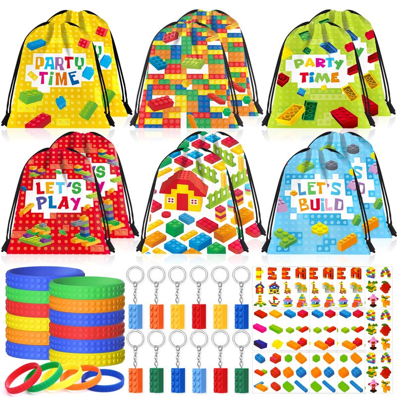 - 48Pcs Building Block Party Favors - You will get 12 building blocks theme drawstring gift bags, 12 building block tattoo stickers, and 24 other items. Each building block gift set is filled with an array of colorful block patterns, suitable for children who love to unleash their imaginations to build something. This set of building blocks party favors is a good choice as boy party favors or girl party favors