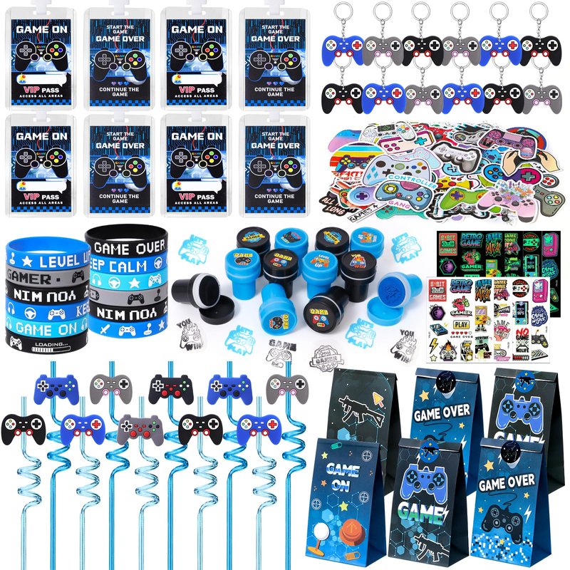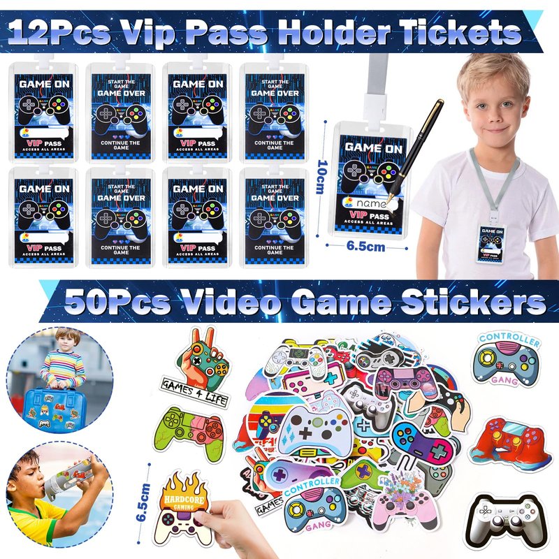 - 136Pcs Video Game Party Favors: We have carefully prepared a set of luxurious and complete game-themed party favors for game fans. It includes 12 drinking straws (6 styles), 12 VIP pass holder tickets, 12 paper bags (with stickers), 12 silicone bracelets (6 styles), 12 game stampers, 12 glow-in-the-dark tattoo stickers, 12 keychains, 50 game stickers. Our kit can help you throw a big party for 12 little ones and bring a lot of fun to the kids