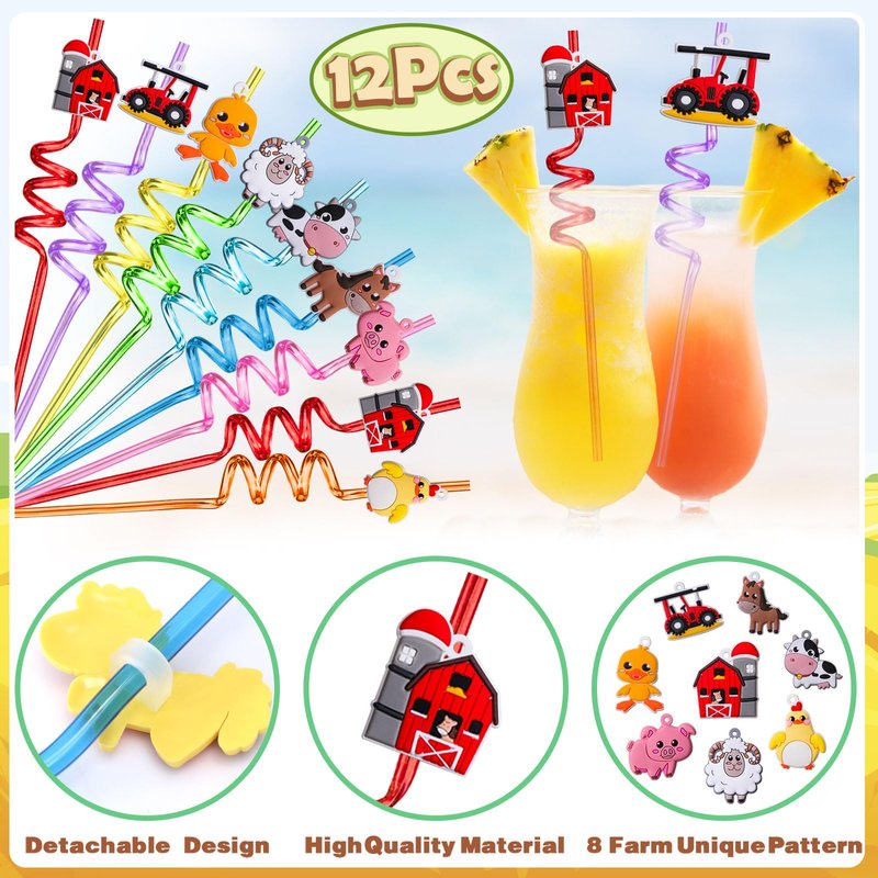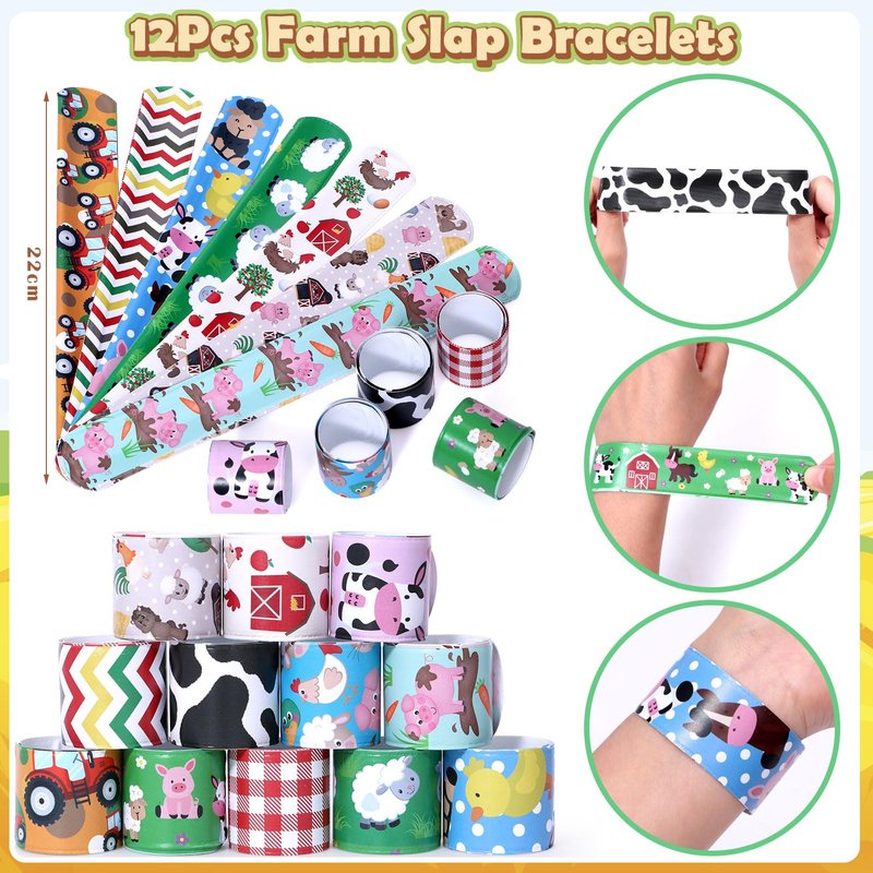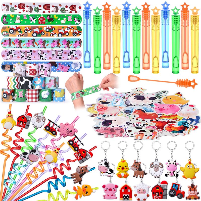- 98Pcs Kids Farm Party Favors Supplies - We carefully prepared a set of fun farm themed party favors. It includes 12 farm plastic straws (8 styles), 12 mini bubble wands (4 colors, star shape), 12 keychains, 12 slap bracelets, 50 animal stickers. Abundant accessories can help you entertain 12 guests and help you hold an unforgettable farm theme party. For kids, these fun and affordable party favors are sure to be a hit