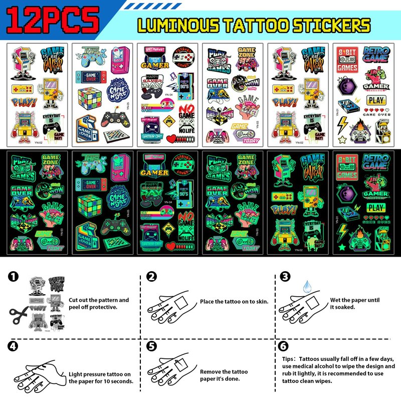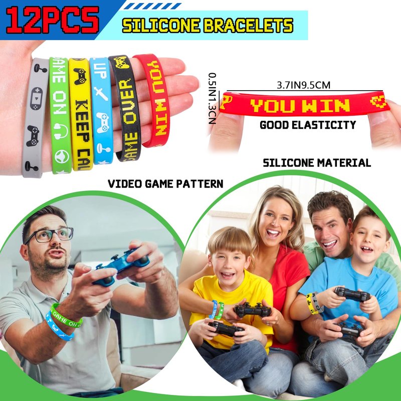 - 12 Sets Video Game Party Favors - Games are a popular theme and we have carefully prepared 12 sets of game themed party favors. It includes 12 non-woven bags (4 styles, exclusive design), 12 silicone bracelets (6 styles), 12 stampers (6 styles, exclusive design), 12 keychains (6 styles), 12 sheets glow-in-the-dark tattoo stickers. Our set can help you entertain up to 12 kids and help them have a fun party