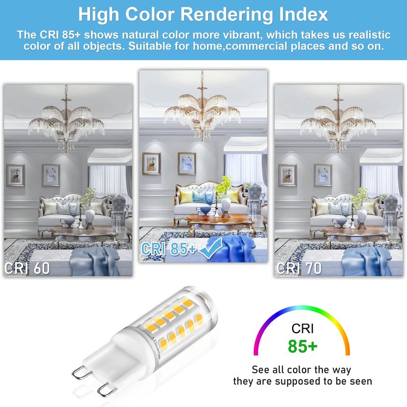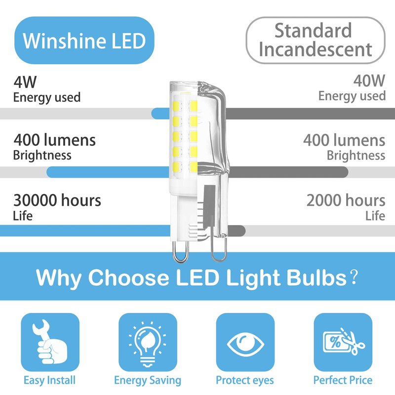 - Natural Daylight 6000K: A brighter and more uniform daylight with the feature of glare-free can be provided by these led G9 light bulbs that the normal 40W halogen bulb cannot achieved. Its stable electronic components is helping to avoid the visible flicker and prevent your eyes from eye fatigue.