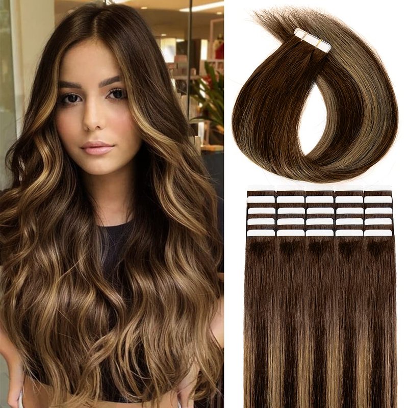 Winsky Tape in Hair Extensions Balayage Human Hair - Black Brown Ombre Glue in Remy Hairpiece 20pcs 50gram 100% Real Human Hair 18"#4T27P4
