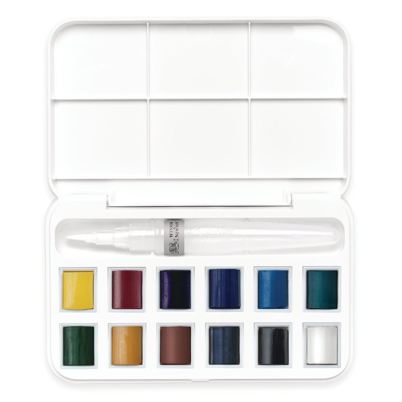 Winsor & Newton Cotman Watercolor Paint Set, 12 Half Pan w/ Water Brush Pen and Mixing Palette