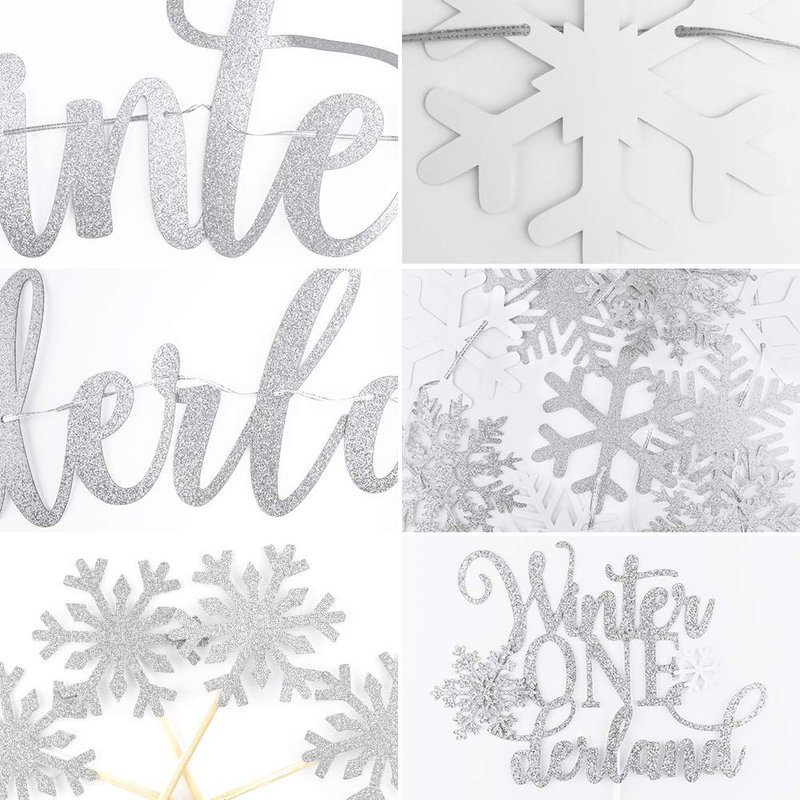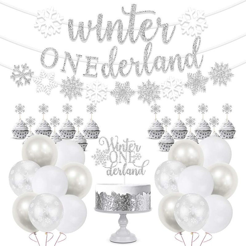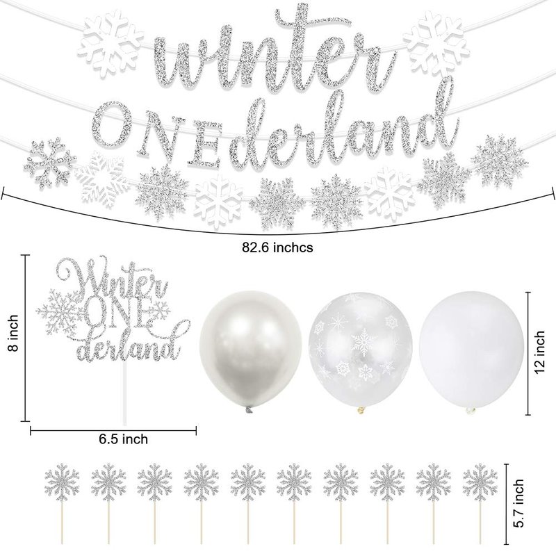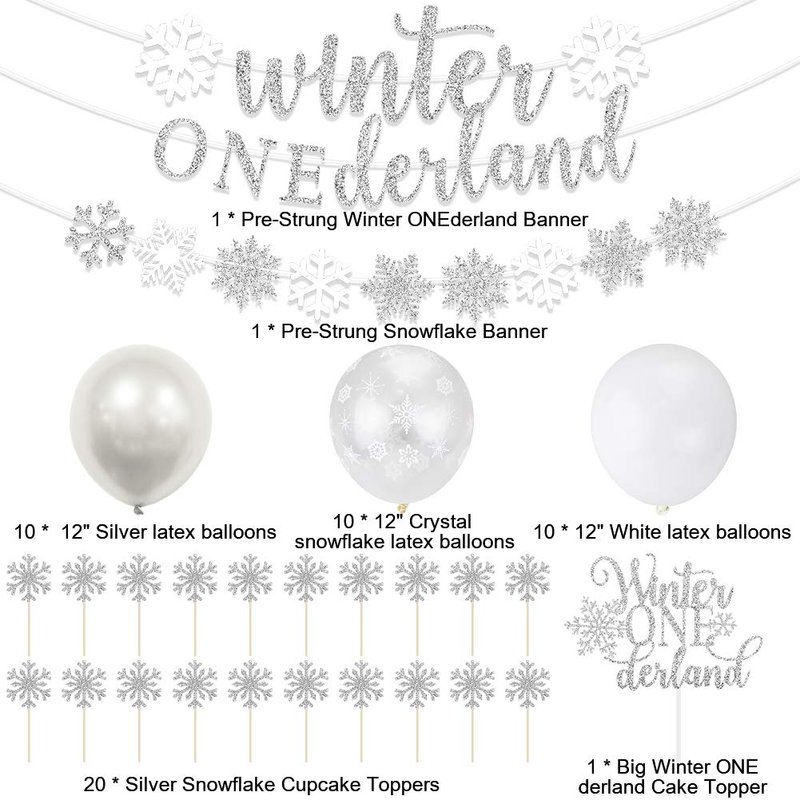 - All in One Party Decoration Kit - You will get: 1 * Pre-Strung Winter ONEderland Banner, 1 * Pre-Strung Snowflake Banner, 1 * Big Winter ONEderland Cake Topper, 20 * Silver Snowflake Cupcake Toppers, 10 * 12" Silver latex balloons, 10 * 12" White latex balloons, 10 * Snowflake Pattern Balloons, help you effortlessly create a beautifully unique party for your occasion.