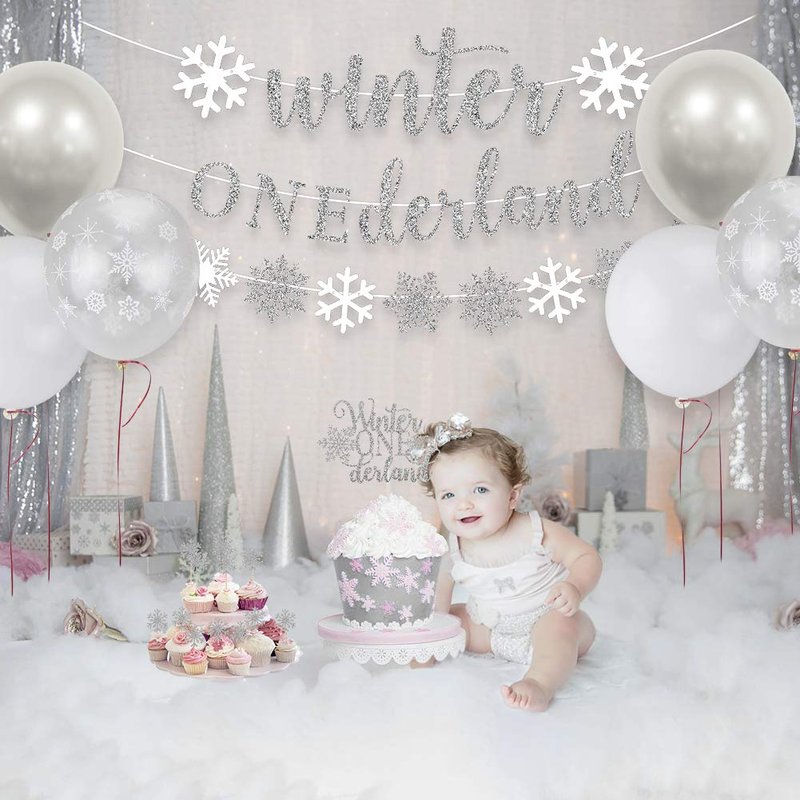 - Winter Onederland Birthday Decorations Set - This winter ONEderland birthday decoration package in silver and white is such a fun winter birthday theme! Celebrate in style this winter with this adorable Winter garland kit !So easy to do, but yet makes a big statement! It is a perfect addition to your girls & boys first birthday party or winter baby shower party supplies.