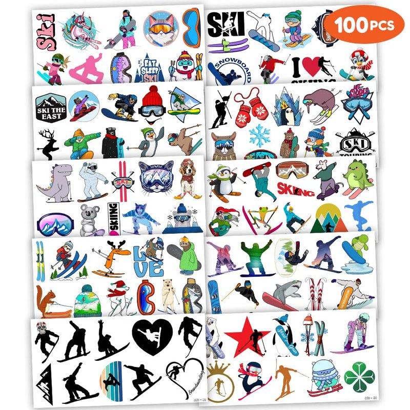 Winter Skiing Temporary Tattoos 10 Sheets 100 PCS Snowboard Party Decorations Favors Supplies Snow Theme Birthday Stickers Gifts for Boys Girls Kids Class School Prizes Carnival Christmas