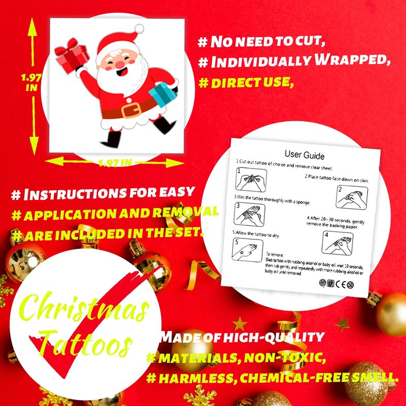 - Christmas Gift: Great for Xmas party for kids, stocking stuffer, Christmas party decorations, DIY decorations. Children will love to apply these tattoos on their face or hands. You can also share with your friends, family, and neighbors to enjoy a pleasant Christmas holiday and Happy New Year.