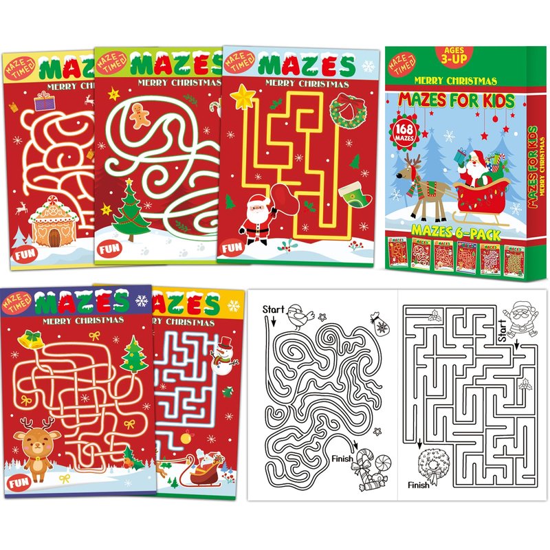 - 【6-BOOK SET of Christmas Theme Mazes】 The package contains 6 maze books with a Christmas theme for kids. Each book consists of 28 mazes. In total, there are 168 unique designs and 6 different difficulty levels, ranging from easy to challenging. Additionally, kids can color the Christmas patterns and characters surrounding the mazes.