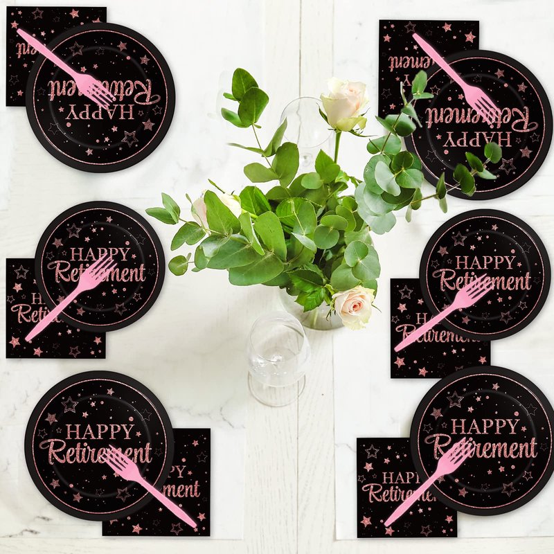 - 【Vibrant Retirement Party Design】Except for the fork, this retirement theme party tableware set is all designed in rose gold vibrant happy retirement patterns. Decorating your retirement party with these tableware kit can make your party full of the festival atmosphere.