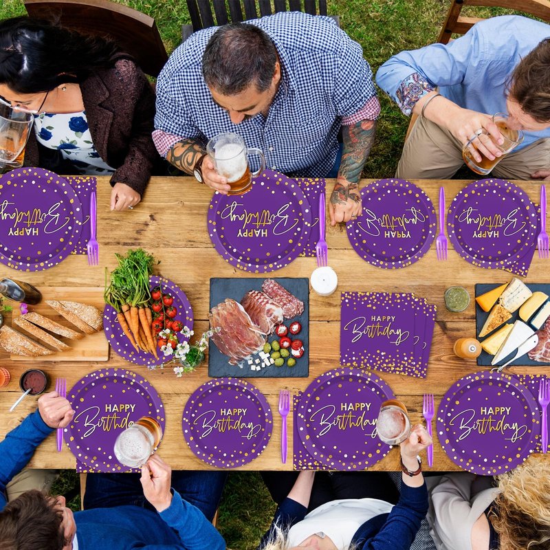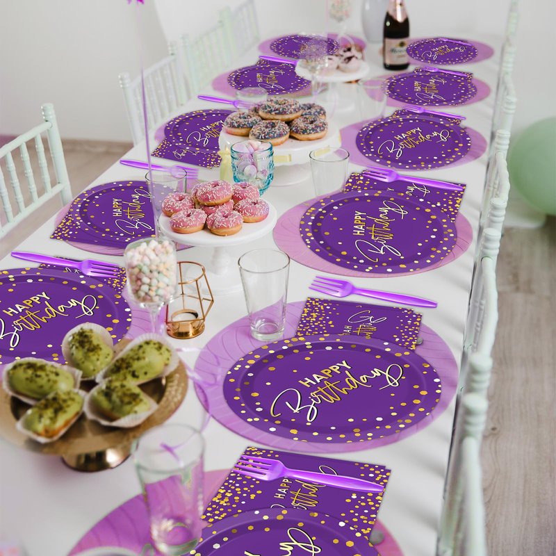 - What you will get: The package comes with 24 sets of purple gold birthday party tableware sets supplies, including 24pcs 9inches birthday paper dinner plates, 24pcs 7inches purple paper dessert plates, and 24pcs happy birthday paper napkins(About 6.5 x 6.5 inches folded, About 13 x 13 inches unfolded), and 24pcs of plastic forks, totally 96pcs, each set serves for 24 guests. Sufficient quantities are enough for your happy birthday party.