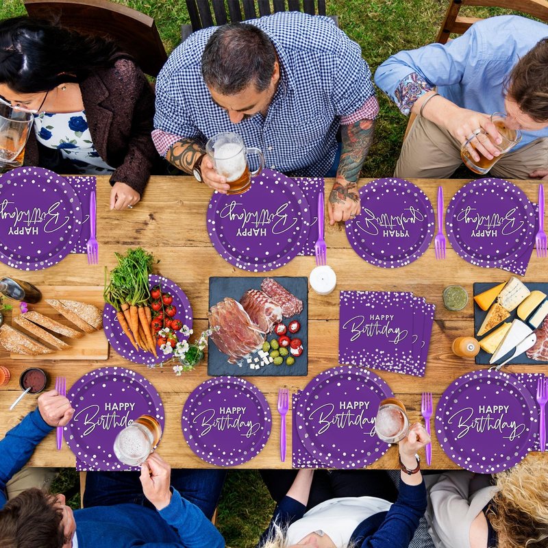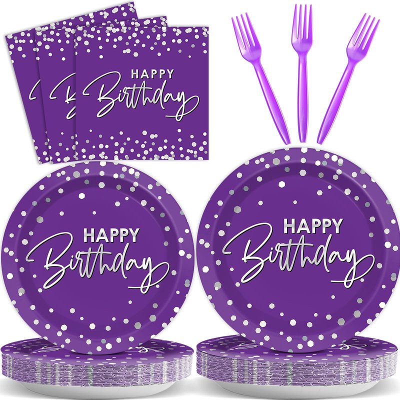 - What you will get: The package comes with 24 sets of purple silver birthday party tableware sets supplies, including 24pcs 9inches birthday paper dinner plates, 24pcs 7inches purple paper dessert plates, and 24pcs happy birthday paper napkins(About 6.5 x 6.5 inches folded, About 13 x 13 inches unfolded), and 24pcs of plastic forks, totally 96pcs, each set serves for 24 guests. Sufficient quantities are enough for your happy birthday party.