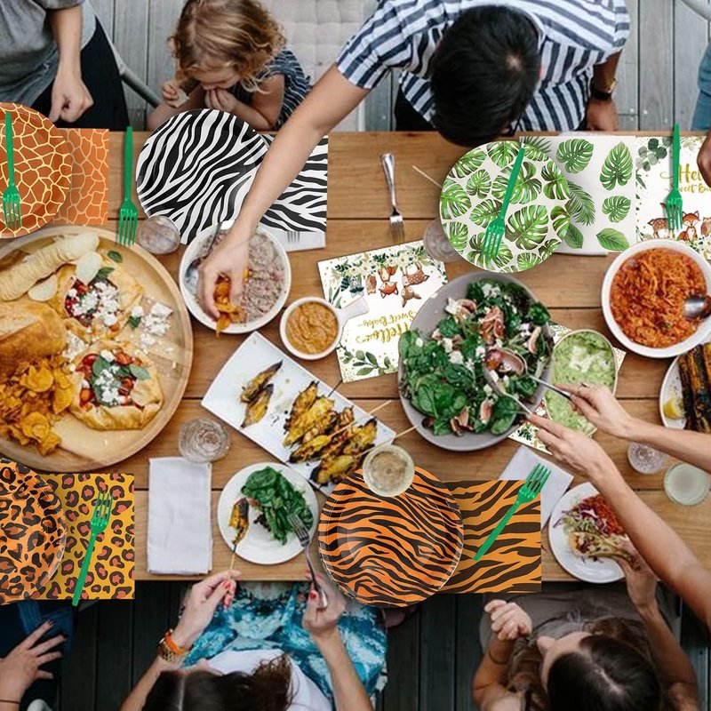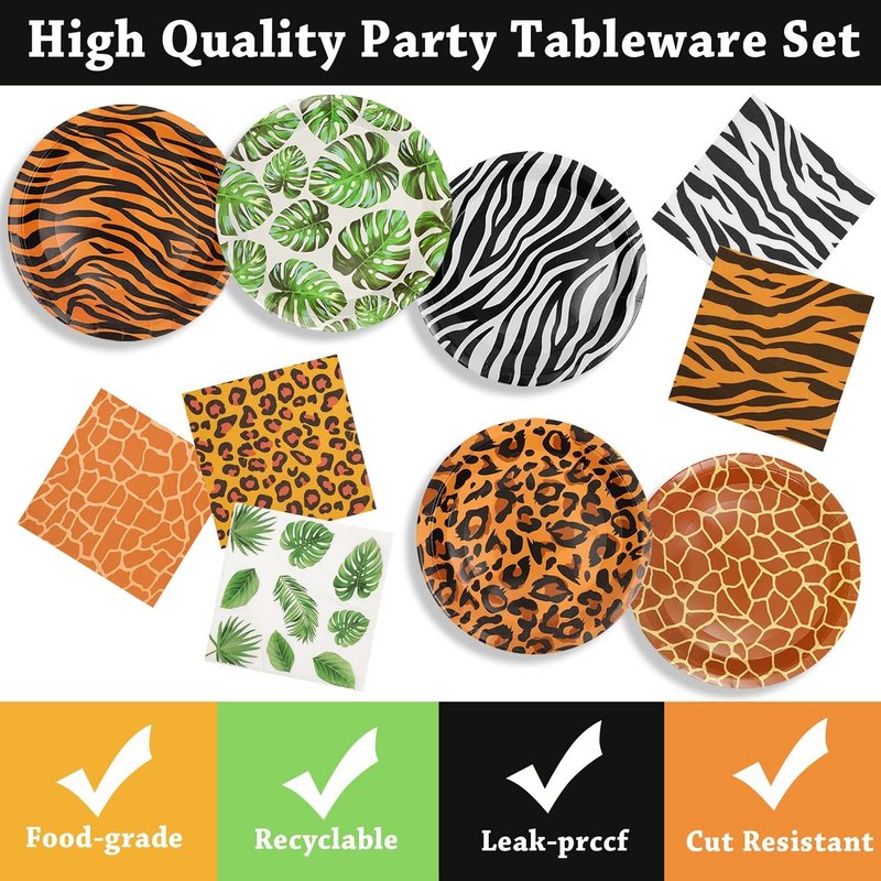 - MUTIPLE ANIMAL PRINT---The product design adopts the elements of jungle safari season, which is more attractive and exquisite.Wild animal prints are printed on plates and napkins, including zebra, tiger, giraffe, cheetah and palm leaf,beautiful patterns will bring your party a lot of joy