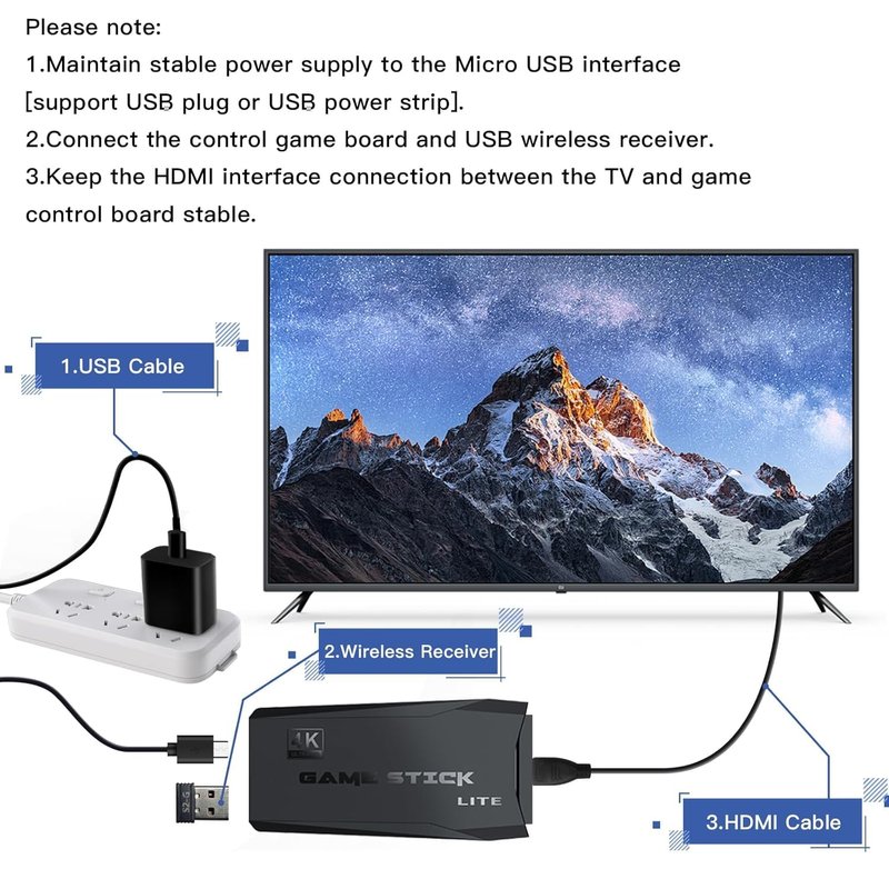 • 🎮【Plug & Play Retro Game Console Stick】Connect the gamepad to the power supply, then plug it into the TV, and adjust the TV power to the HD channel to display the game list screen on the TV. The steps are as follows :1. Connect the HD output of the TV 2. Insert the built-in TF game content card 3. Using the charging adapter to connect the power supply will turn on automatically. (2 wireless controllers require 4 AAA batteries, not included in the package)