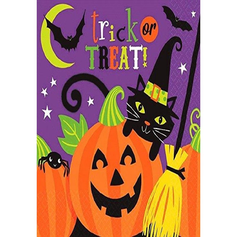 - Halloween napkins feature a black cat, broomstick, smiling jack-o'-lanterns, and more. "Trick or Treat" is printed across the top against a purple background.