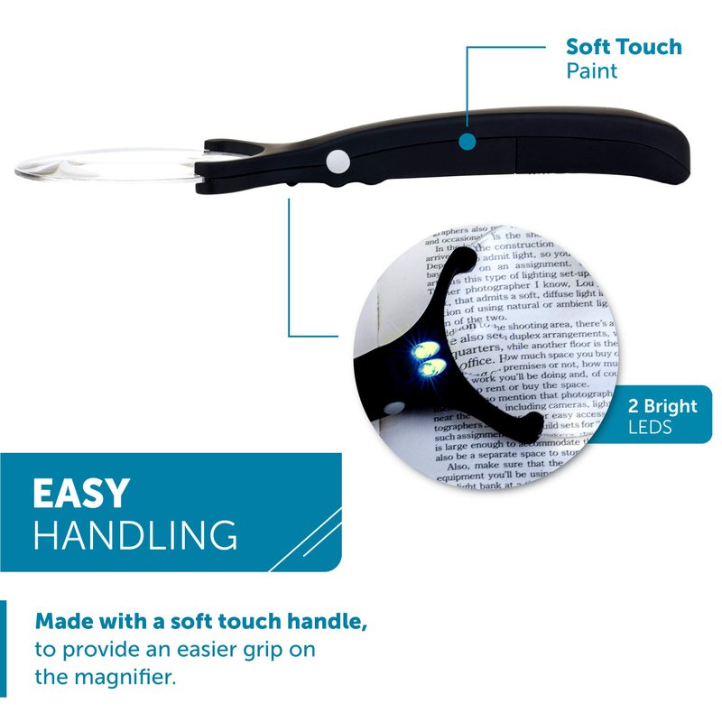 - EASY HANDLING: Made with a soft touch handle, this reading magnifying glass is durable and easy to use for a variety of applications. It is powered by 2 AAA batteries that are included and easy to replace when needed.