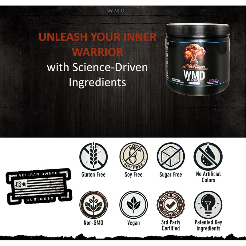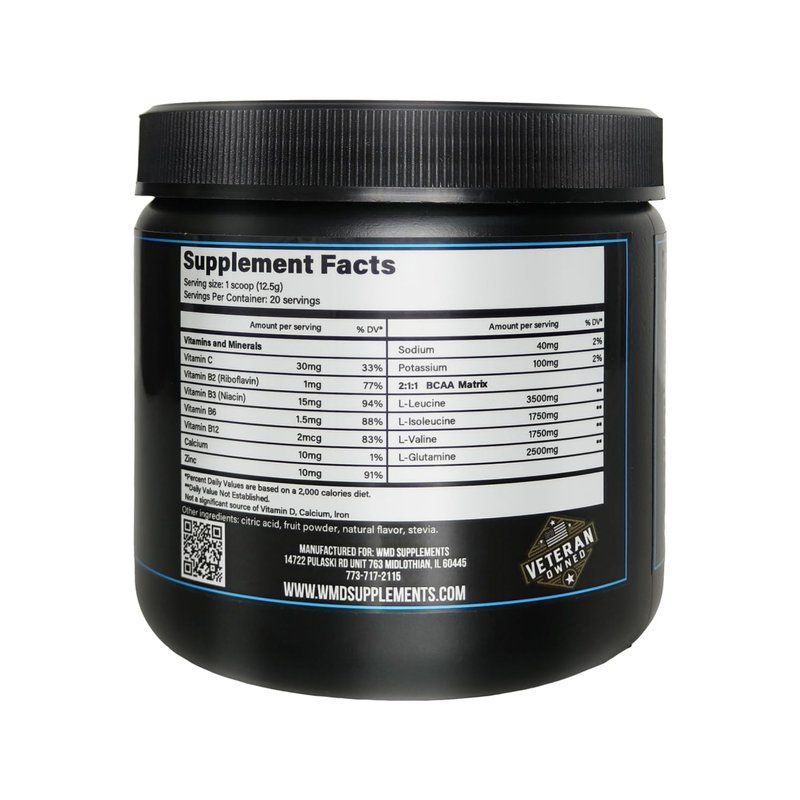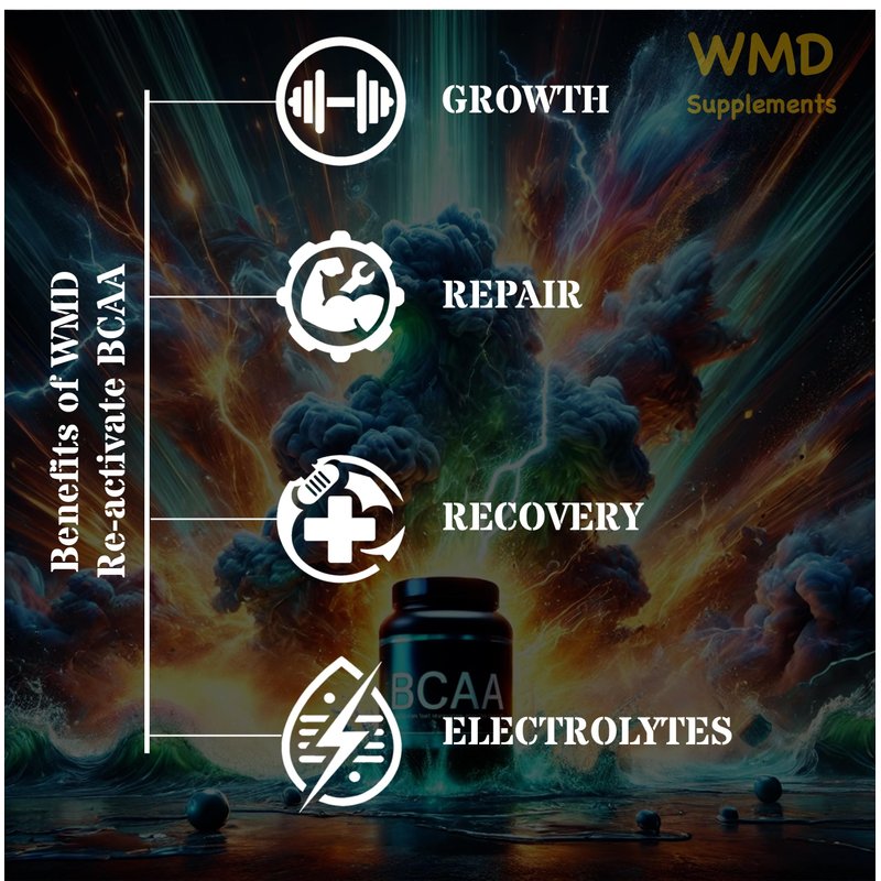 Unlock your true potential with WMD Re-Activate BCAA, the ultimate blend for muscle growth, repair, and recovery. Each serving delivers a powerful 7g of BCAAs in the optimal 2:1:1 ratio to fuel your muscles and promote lean muscle development. But we didn't stop there—Re-Activate is infused with essential electrolytes like sodium and potassium to keep you hydrated and maintain peak performance during intense workouts. Packed with a unique blend of key vitamins such as Vitamin C for immune support, B-Vitamins for energy metabolism, and Zinc for muscle function, WMD Re-Activate ensures you're not just recovering but thriving. Enjoy the invigorating taste of natural blueberry flavor, free from sugars. Formulated by an MD and backed by rigorous 3rd party testing, our transparent and quality-focused formula is here to support you every step of the way. Elevate your workout, enhance your recovery, and unleash the power within you with WMD Re-Activate BCAA.
