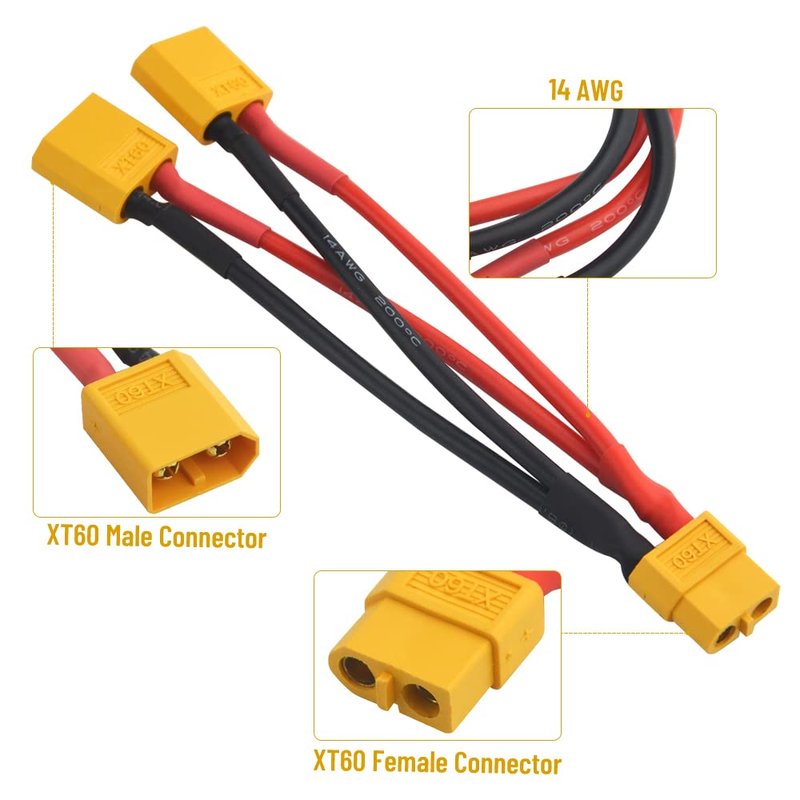 - Package Content: 2 pcs XT60 parallel connector, ideal for DJI Phantom Quadcopter and other Aerial Multicopter helicopter aircraft.
