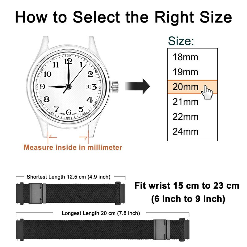- Select Band Width (Size): 18mm 19mm 20mm 21mm 22mm. Compatible with most traditional watches and smart watches which lug width is standard 18 19 20 21 22 millimeters. In order to get a suitable strap, please measure inner distance in millimeter between two horns on your watch.