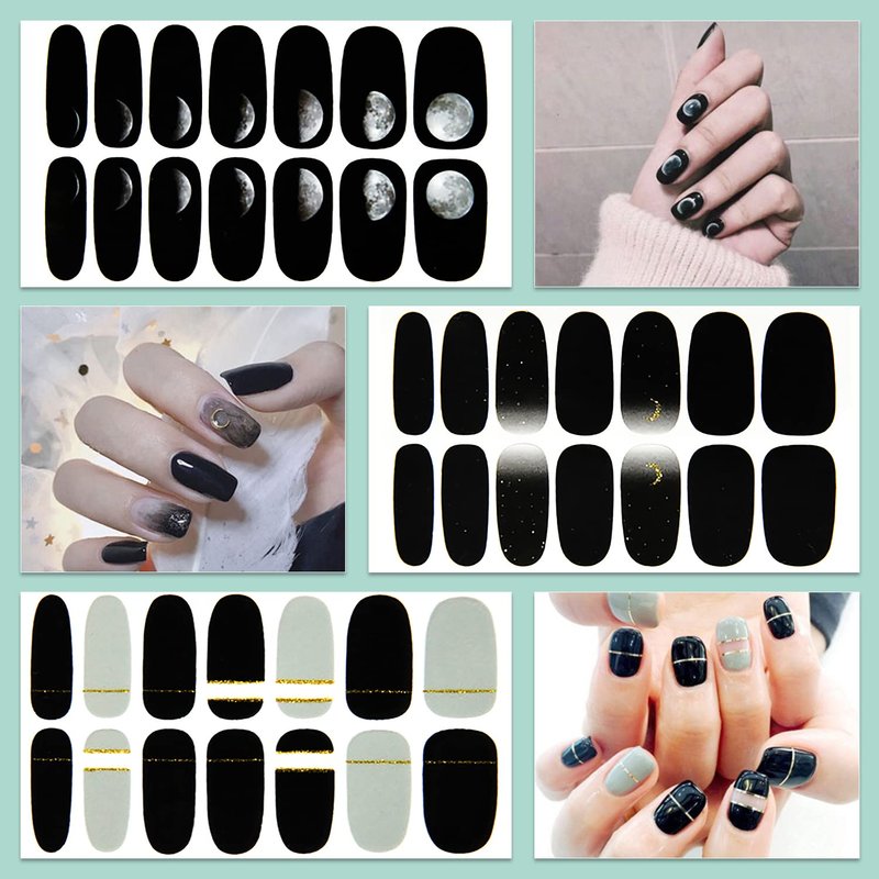 • 【PACKAGE CONTENTS】: 12 sheets black self-adhesive nail strips + 1pc moon shape nail file. 14 pieces for each sheet, 168 pieces in total. You can design unique nails art as you like.