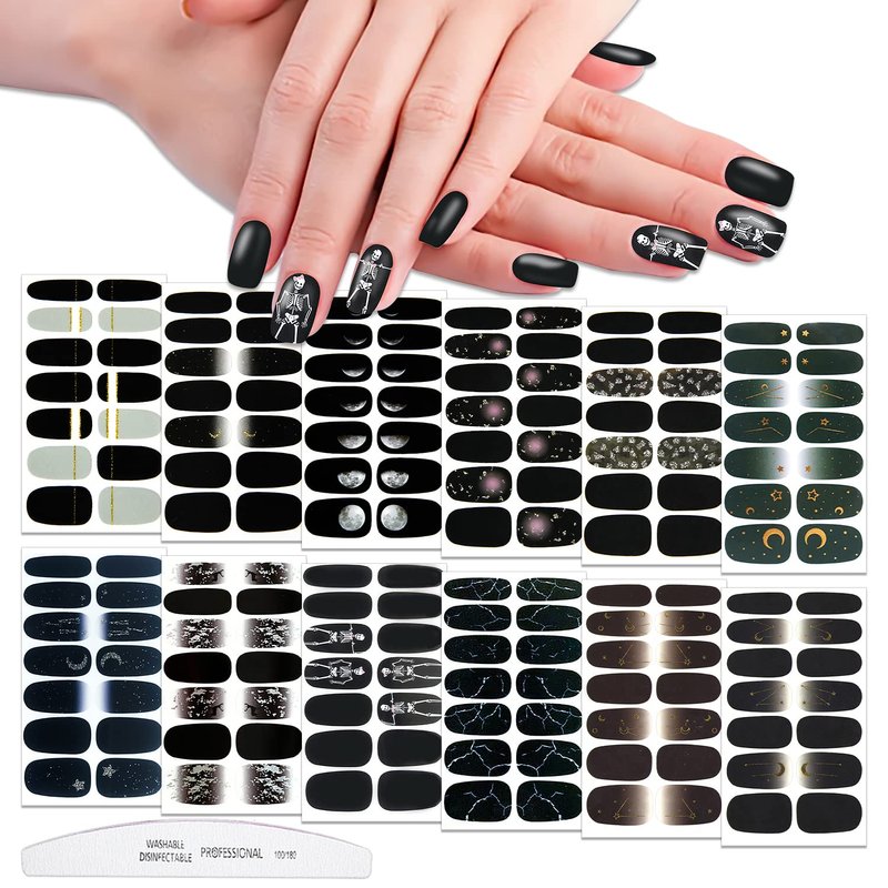 • 【12 DIFFERENT BLACK STYLE DESIGNS】: these full nail wraps including various different black designs, Glitter, skulls, marble, stars and moons, etc. that are fashionable to mix up with different style everyday, so it will make your nails more dazzling and charming.