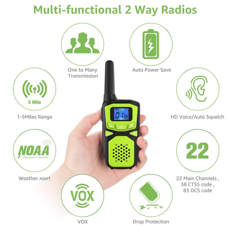 - 【BEST GIFT FOR YOUNG AND OLD】 - Long range kids walkie talkies bring more fun to communicate with your kids, friends and parents. Get ready for outdoor living, hiking, camping, hunting, skiing and biking and stay connected at all times.