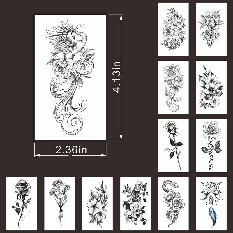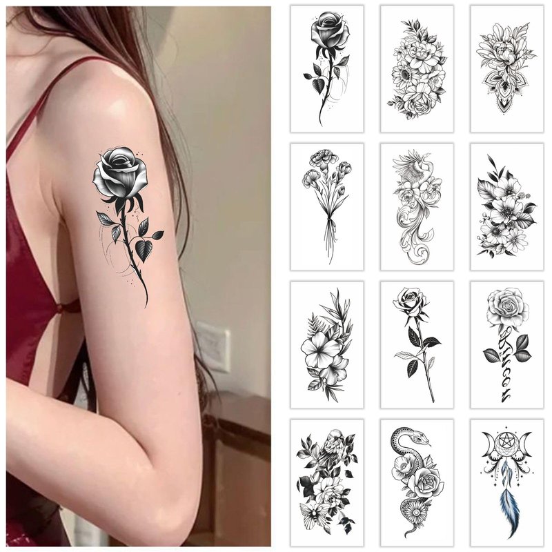 Womaha 12 Sheets Black and White Flower Temporary Tattoos for Women and Girls Fake Tattoo Stickers