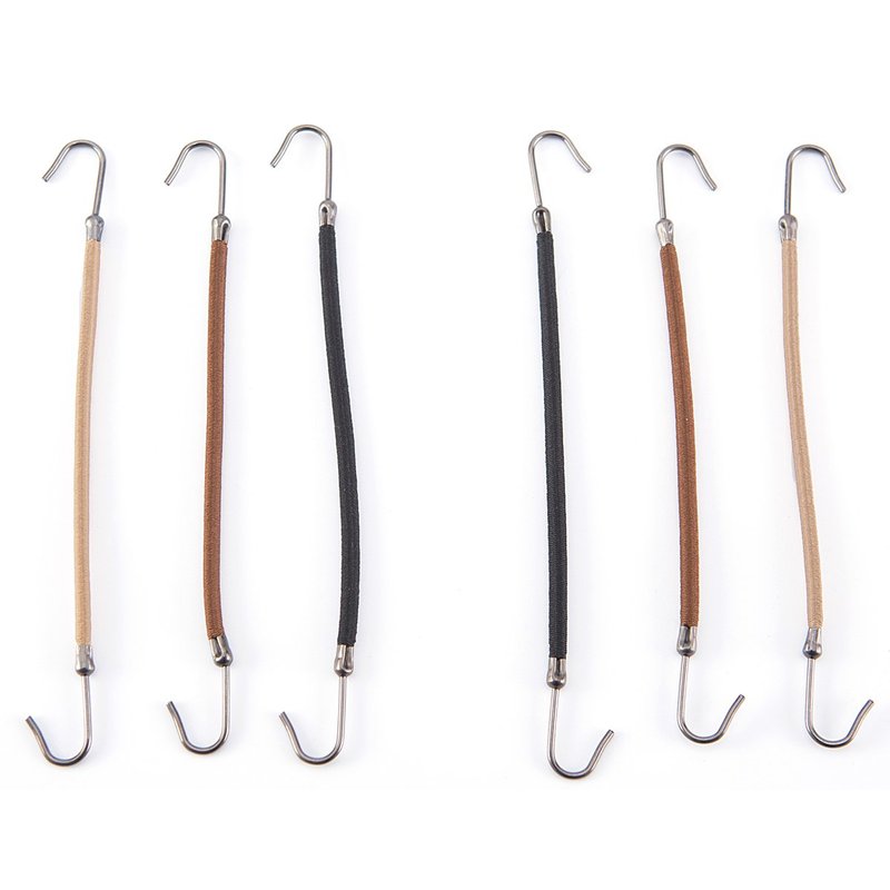 Mini skater bungee elastics band hooks allow a custom- fit ponytail no matter your hair texture. It help to creates the smooths natural ponytail in seconds. You just need to hook one end into hair and wrap the band around hair, the hook the other end into hair.; Features: Material – elastic and metal; Color – black, brown and apricot, 5 pcs each color; Size – about 5.3 inch ; Package includes - 5 x Black + 5 x Brown + 5 x Apricot ponytail hooks