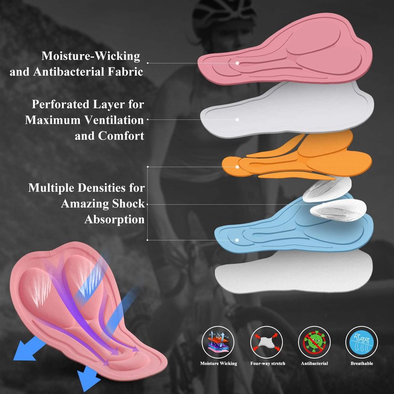- 4D Gel Cushion Pad: The women padded spin bike shorts hold their MTB Liner pad in the ideal position throughout the ride. The 3D stereoscopic pad made of high-density foam and silicon gel is adequately sized and sufficiently thick to effectively minimize vibration on long rides. The thickness of the bike chamois pad is just the right amount that you don’t feel like you’re wearing a diaper while your butt won't hurt and no saddle sore even in long bike riding.