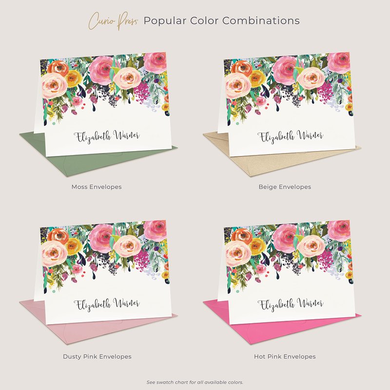 - ✔ MAKE IT YOURS: Customize the stationery note set with your choice of name and envelope color (from options shown). Return address printing on envelope flaps is available for an additional fee, with black ink standard for all color envelopes, and color ink available for white envelopes.
