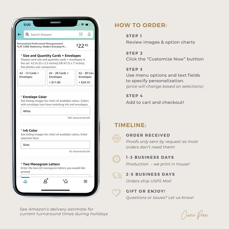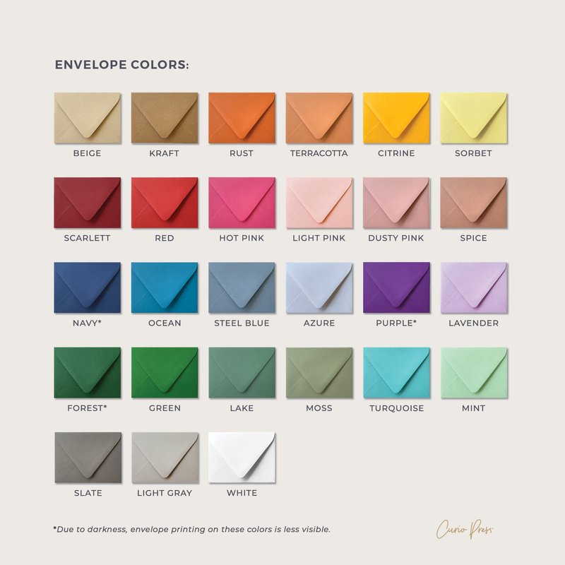 - ✔ HOW TO ORDER: Review images & color charts, then click “Customize'' to choose sizes, quantities, and provide personalization. Text on stationery notecards and envelopes will be printed exactly as given, so please double check all spelling before adding to cart.
