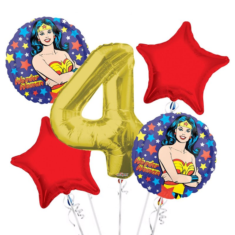 Wonder Women Balloon Bouquet 4th Birthday 5 pcs - Party Supplies Wonder Women Balloon Bouquet includes: 1 Giant Number 4 Balloon, 34in 2 Themed Round Balloons, 18in 2 Red Star Balloons, 18in Balloons sold without Helium. Helium tanks and air pumps can be purchased separately on our site.