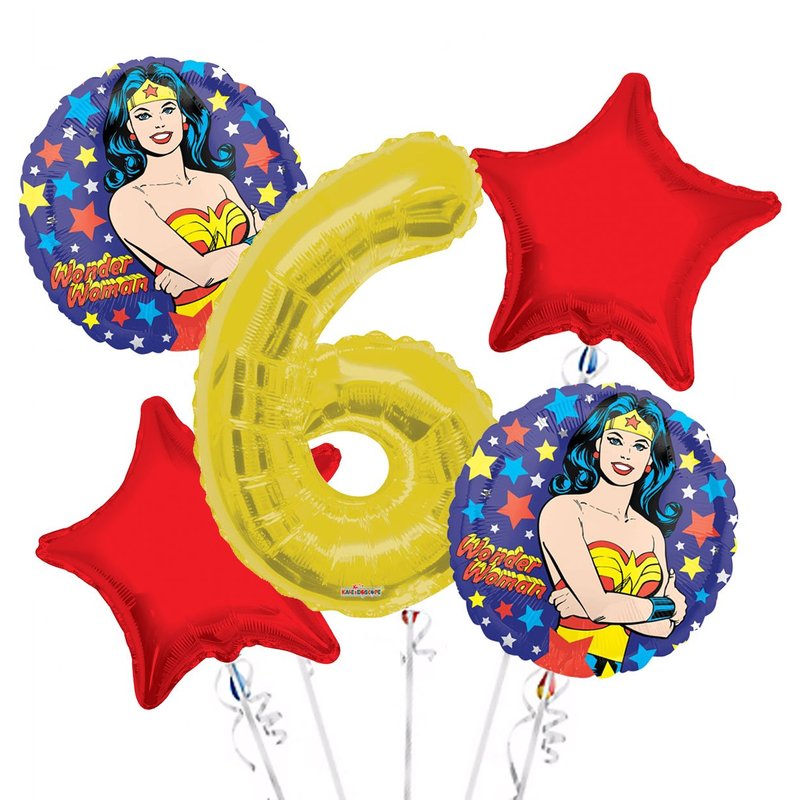 Wonder Women Balloon Bouquet 6th Birthday 5 pcs - Party Supplies Wonder Women Balloon Bouquet includes: 1 Giant Number 6 Balloon, 34in 2 Themed Round Balloons, 18in 2 Red Star Balloons, 18in Balloons sold without Helium. Helium tanks and air pumps can be purchased separately on our site.