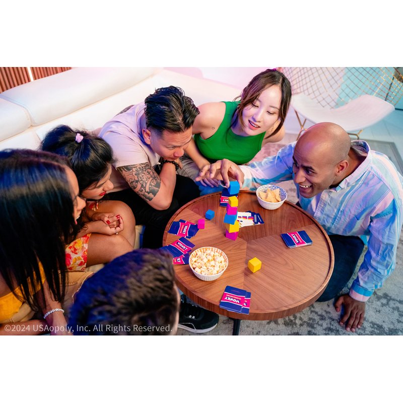 - Stack til you cant Stack anymore - Be the first to clear your hand in Wonky without toppling the tower, then watch your friends and family squirm as they place the next block