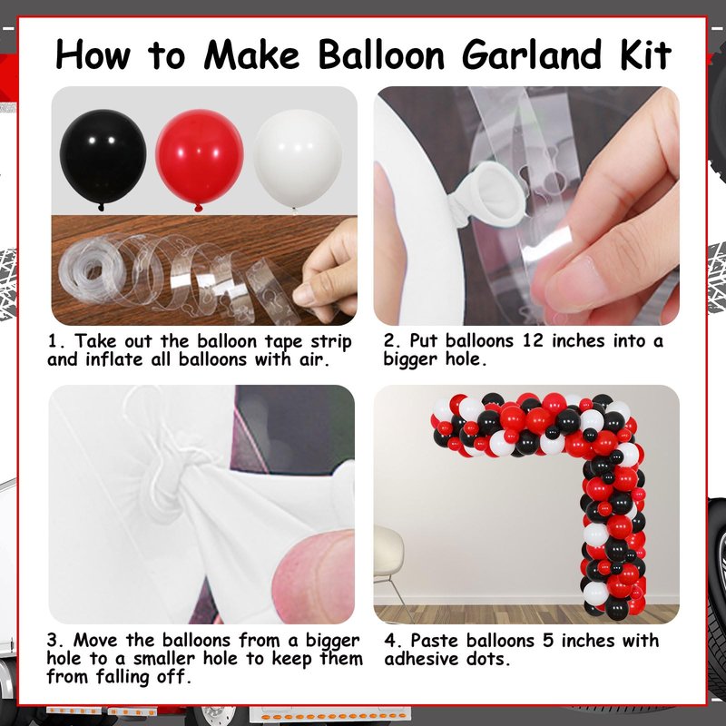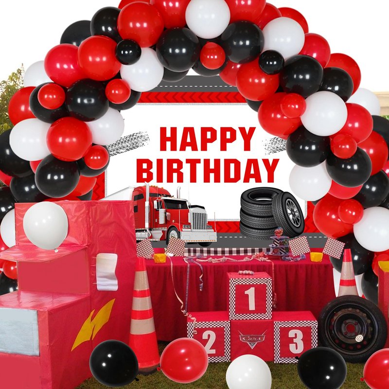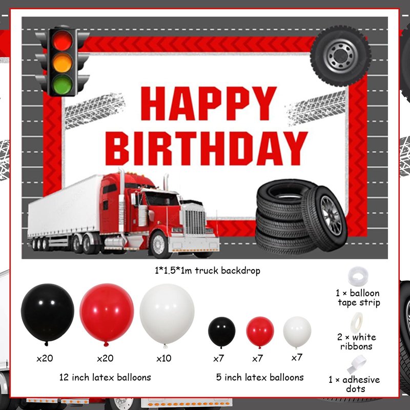 - The package includes: 50x latex balloons 12 inches (20 red, 20 black, and 10 white), 21x latex balloons 5 inches (7 red,7 black, and 7 white), 1x happy birthday semi truck backdrop, 1x roll of balloon tape strip, 1x roll of adhesive dots and 2x white ribbons.
